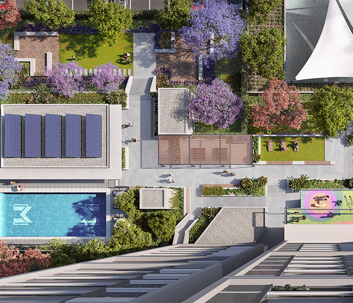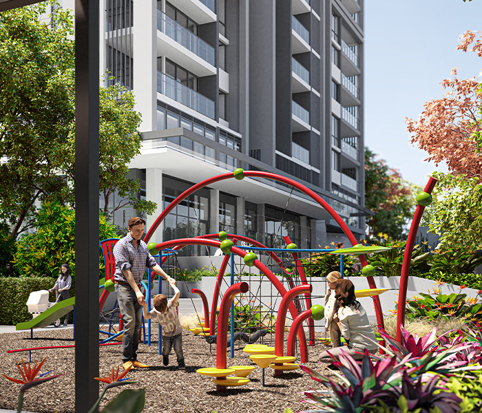 A private 2050sqm elevated garden will boast a luxury outdoor resort-style pool, spa, BBQ pavilion and playground. Dedicated onsite building management to lease properties, inspect grounds and facilities and conduct all maintenance. Superbly equipped indoor wellness centre with a gym and sauna. My Parcel Locker systems available so that residents can fulfill their online shopping needs and never miss a delivery.