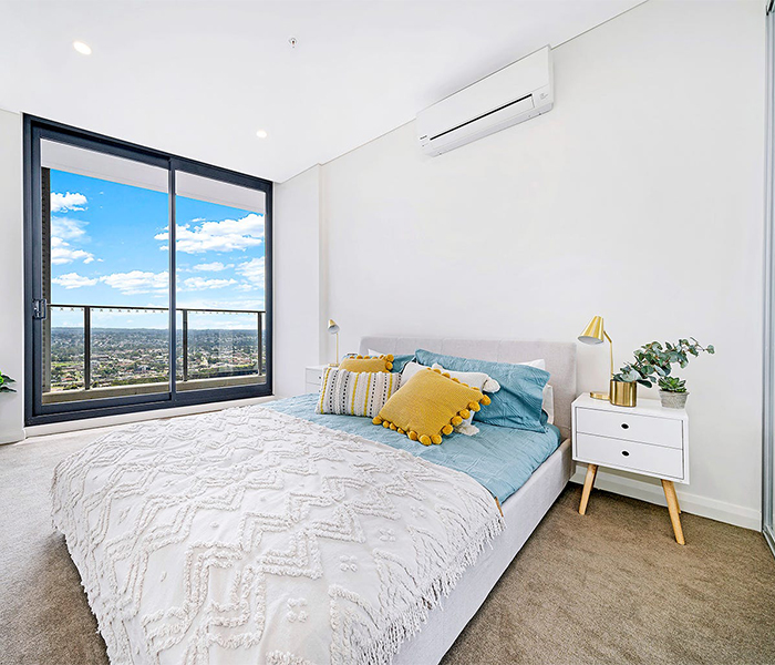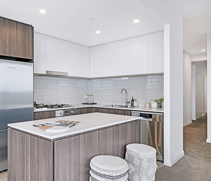 A choice of two interior colour schemes in lighter and warmer tones cater to a variety of tastes. Sleek and minimalist designer bathrooms feature floor-to-ceiling large-format tiles, baths and semi-frameless shower screen. Gourmet kitchens are appointed with polyurethane joinery, hardwearing reconstituted stone benchtops and quality European appliances, including a 4 burner gas cooktop. Additional details include built-in wardrobes, air conditioning, audio visual intercom and laundries with dryers.