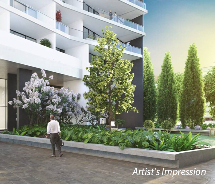 The green oasis on the ground floor is a grand entry statement. The integrated park, plantings and retail softens the streetscape and welcomes its residents home to a new level of living in Liverpool. Leafy trees along the tiered terraces invoke a sense of harmony, where you can meet with neighbours or utilise the space for personal pursuits or just watch the sunlight change as it filters in and around this tranquil space.
